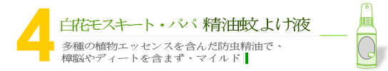植物処方により、植物精油を採用し、蚊の嫌いな匂いを出すことができ、蚊駆除剤です。多種の植物精油やフィトンチッドなどの心と体の健康に役立つ成分を含み、単独でエアフレッシャーとしてご使用いただけます。モスキート・パパ天然精油虫刺され防止液には、化学香料や防腐剤は含まれていません。樟脳やディート( DEET )の成分が含まれておらず、安全性が高いため、ご家族全員でお使いいただけます。