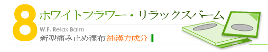 ホワイトフラワー・リラックスバームは、 GMP の優良薬品工場で製造された漢方鎮痛湿布です。おだやかな効き目で、効果が長続きします。使いやすく、そのまま患部に貼るだけでよく、通常の湿布のような裏に布を当てる面倒さと不便さはありません。